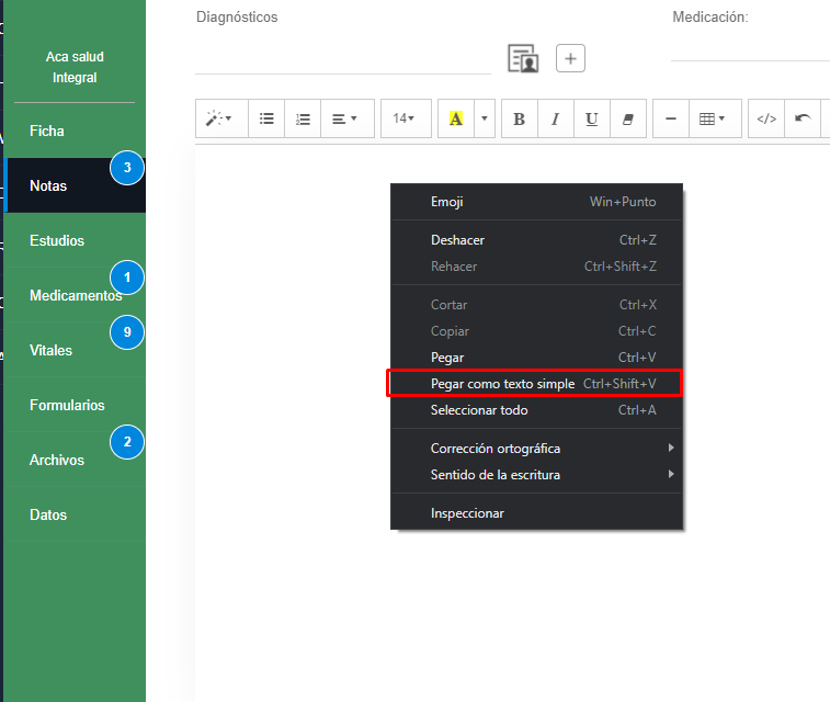 Nota: en caso de que se quiera pegar un texto dentro de Asystir, por ejemplo, en una nota de evolución o un formulario, es altamente recomendable pegar el texto sin formato. Para hacerlo se deben seguir los siguientes pasos: