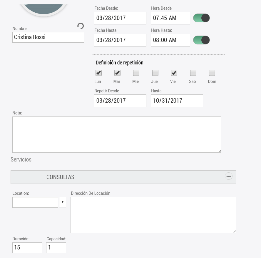 Definir duracion de un turno o servicio