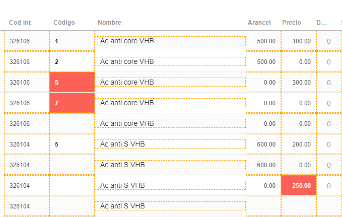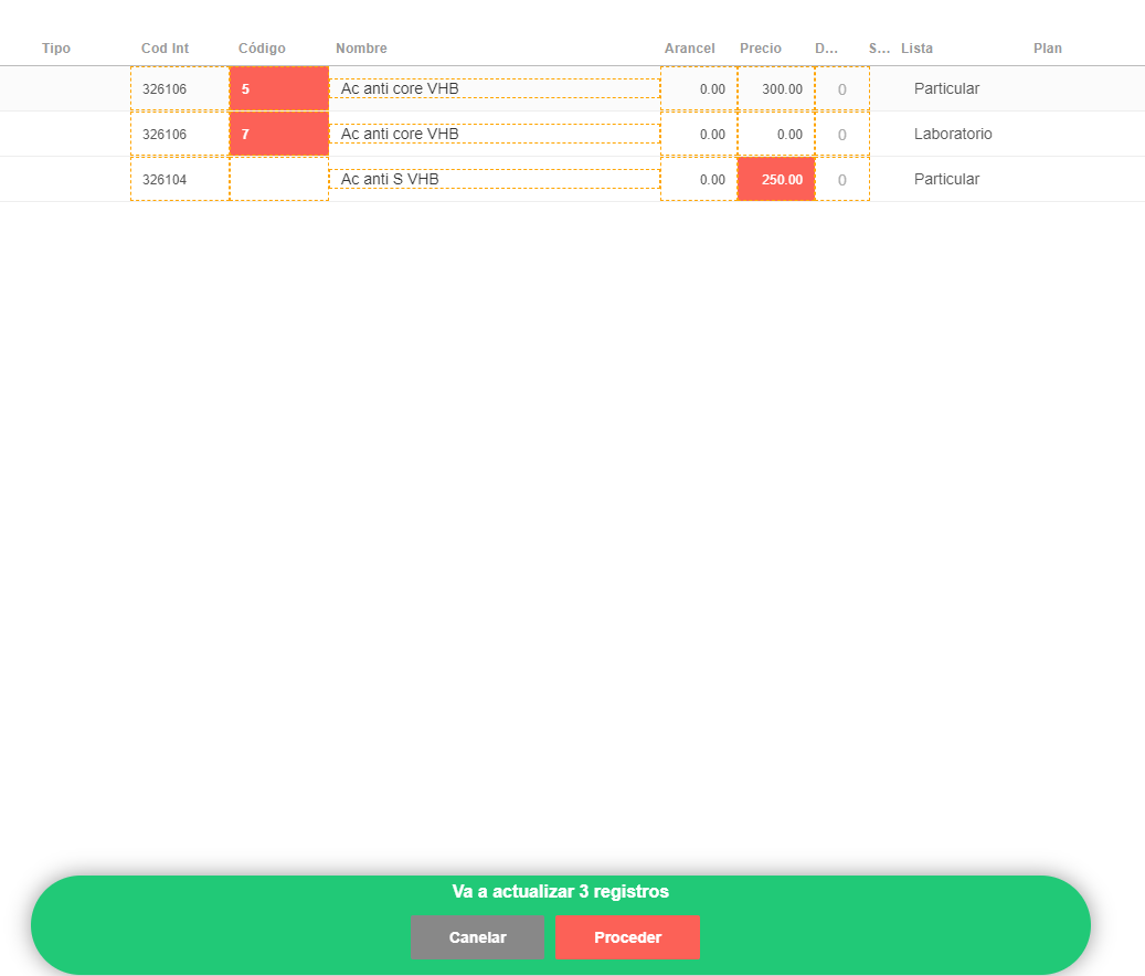 Al presionar "Actualizar", muestra los registros que van a ser modificados y resalta los campos modificados. Para confirmar los cambios, presionar "Proceder", de lo contrario, "Cancelar".