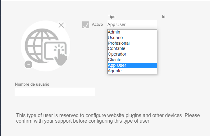 que figura del lado izquierdo en la barra superior. - Mostrará la pantalla para cargar o tipear los datos del usuario que se está creando. Hay diferentes tipos de Usuarios con diferentes accesos y Restricciones. Para seleccionar y cambiar el tipo de usuario hacer clic en Tipo y ahí mismo mostrará las opciones de usuarios. Elegir App User.