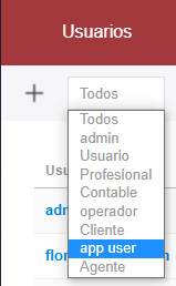 - El sistema retornará a la pantalla principal de Usuarios. Para acceder al token necesario para configurar el plugin o anunciador de turnos, hacer clic en el menú desplegable que permite filtrar por usuario y seleccionar app user