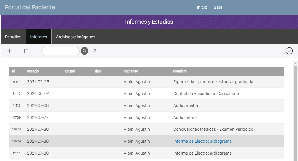 - El paciente puede imprimir los informes desde el botón de impresión,