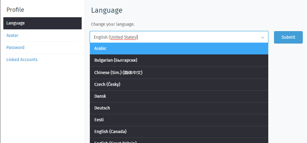 Para cambiar el idioma, hacer clic en el círculo con las iniciales del usuario, hacer clic en Profile.