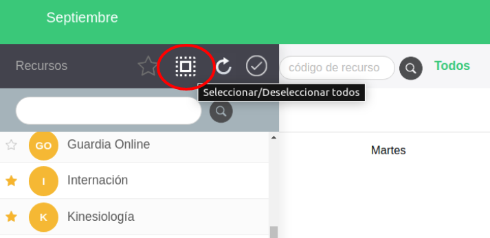Para seleccionar a todos los recursos, marcados como favoritos puede usar el icono de seleccionar o deseleccionar todos.